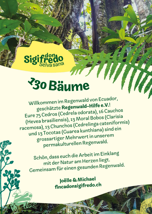 Nachdem unser Vorstand die Finca Don Sigifredo kennen gelernt hatte und das Projekt und die Ideen vorgestellt wurden, kam sehr schnell die Idee diese Organisation zu unterstützen. Unser Verein Regenwald-Hilfe e.V. hat sich somit dazu entschlossen 130 Bäume im ecuadorianischen Regenwald zu pflanzen. Die gepflanzten Bäume bieten den Tieren Schutz und Nahrung, den Einheimischen die Möglichkeit zu erkennen wie wichtig Artenschutz ist und unserer grünen Lunge die Möglichkeit besser atmen zu können.