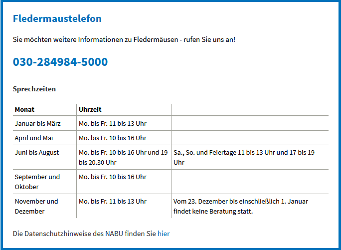 - NABU-Fledermaus-Hotline: NABU Expert*innen und die Kolleg*innen der NABU-Fledermaus-Hotline beantworten alle Fragen rund um die kleinen Flugakrobaten und geben wertvolle Tipps zum Fledermausschutz.