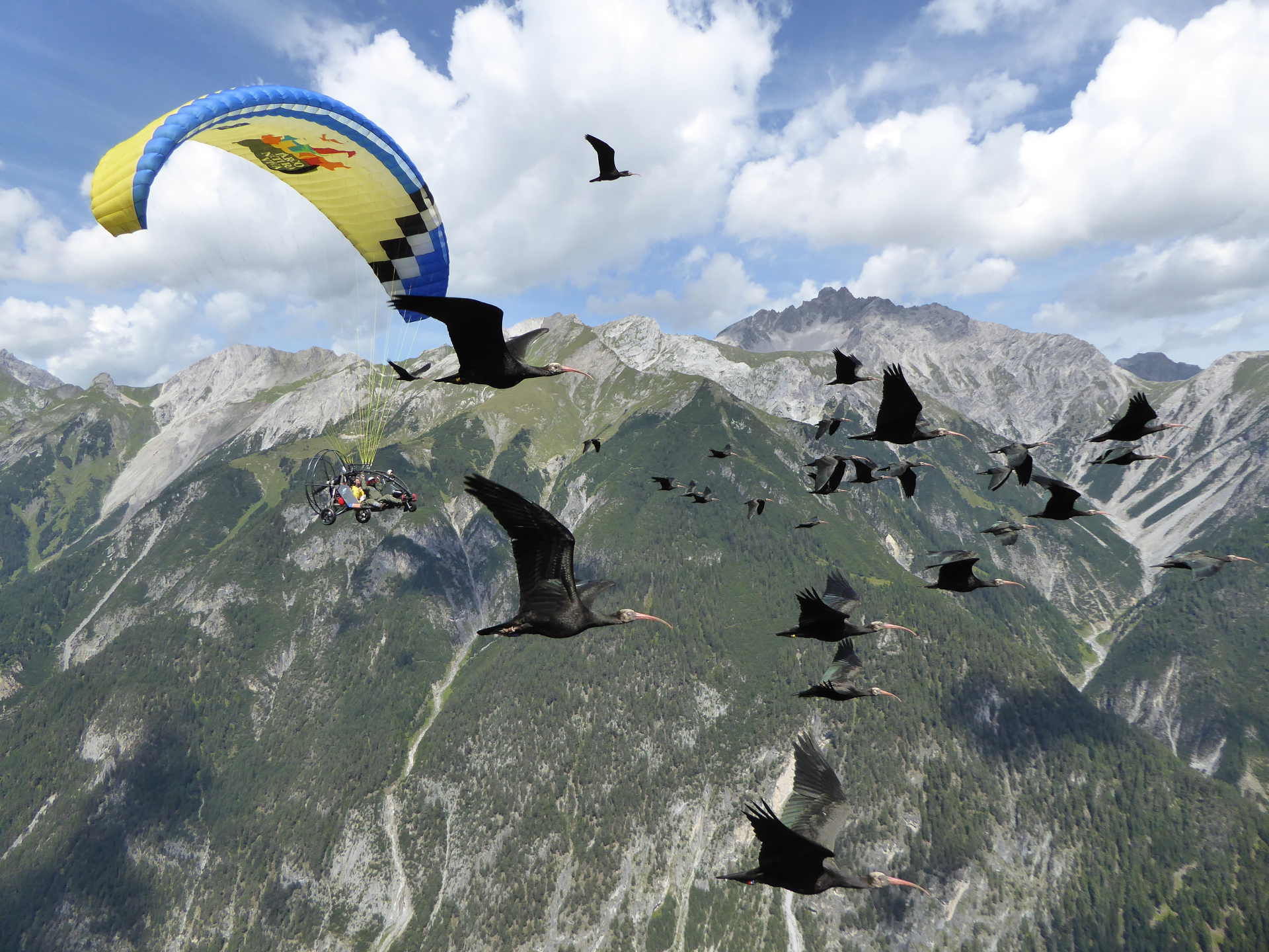 Waldrapp-Schutzprojekt im bayerischen Burghausen. Dort werden schon seit über 12 Jahren Waldrappe gezüchtet und auf das Leben in freier Waildbahn vorbereitet. Weitere Schutzprojekte mit Auswilderungen finden in Österreich und in Italien statt. Das Problem der Auswilderung: Waldrappe sind Zugvögel, die ihre Route von ihren Eltern lernen. Werden Sie vom Menschen aufgezogen, so funktioniert das logischerweise nicht. Die Lösung, die man in den Schutzprojekten dafür fand, ist originell: Mit Leichtflugzeugen wurde den Vögeln der Weg in die Überwinterungsgebiete, zum Beispiel in die Toskana, gezeigt. In den Folgejahren finden sie den Weg dann schon von allein.