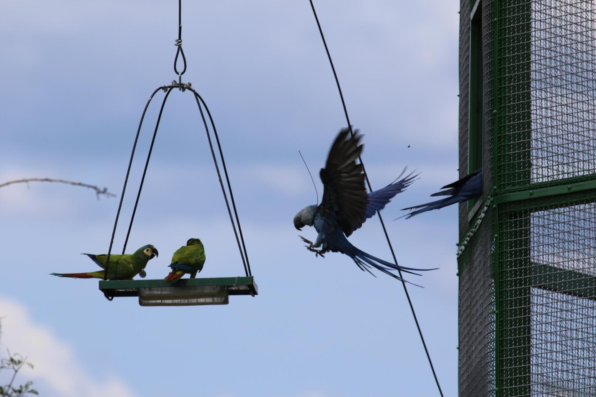 Auch diesmal werden die blauen Papageien während des Release von heimischen Rotrückenaras begleitet. Diese neun Gefährten werden den unbedarften Spix Aras dabei helfen, sich in der ungewohnten Umgebung zurechtzufinden. Am besagten Morgen versammelte sich eine Gruppe interessierter Menschen, um in freudiger Erwartung den ACTP Direktor Brasilien und Manager des Spix's Macaw Release Center bei seiner Arbeit in der Auswilderungsvoliere zu beobachten. Dr. Cromwell Purchase fütterte wie gewohnt die Vögel, um kurz danach die Türen der Voliere für die Tiere zu öffnen. Nachdem vier Rotrückenaras direkt das Gehege verließen, folgte gegen 7:00 Uhr der erste und dann weitere Spix Aras in einem Abstand von ein paar Minuten. Die Vögel unternahmen kurze, neugierige Ausflüge und kehrten immer wieder in die Voliere zurück. Ein voller Erfolg!