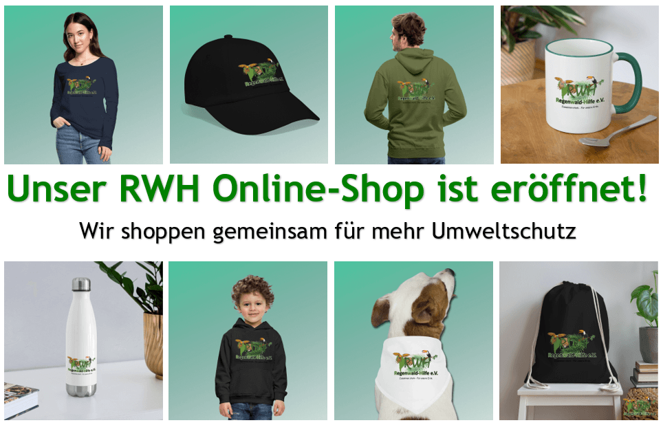 Wir haben den Shop eingerichtet und die Artikel, Farben und Designs, die wir dir anbieten wollen, ausgewählt. Unser Online Shop Betreiber macht alles andere: Einkauf und Bereitstellung, individuelles Bedrucken, Versand und Abwicklung der Bezahlung - alles aus einer Hand. Und wenn Du Fragen zu den Artikeln oder der Lieferung hast, steht dir unser kompetentes Serviceteam (info@regenwald-hilfe.de) sowie eine Hotline (0160 37 87 577) zur Verfügung.