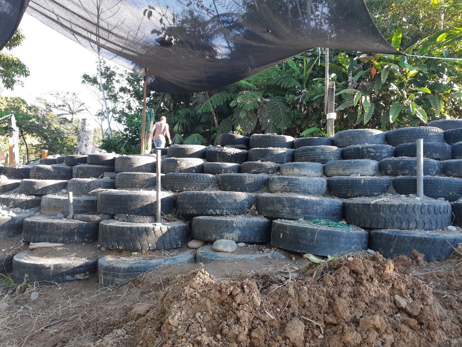 Die Zufahrtsstrasse zum Haus der Finca drohte abzurutschen. Deshalb wurde aus alten Autoreifen die alle mit Schrauben miteinander verbunden und dann mit Kies und Sand gefüllt wurden eine Stützmauer gebaut. Eine betonierte Mauer würde wegen der starken Regenfälle innert kürzester Zeit kaputt gehen. So können die gebrauchten LKW- und Autoreifen nochmals verwendet werden. Die Reifen werden in Ecuador leider nicht recycelt sondern einfach auf die Mülldeponie geschmissen. Nach einer Weile wachsen Gras und andere Pflanzen drüber und man sieht nicht mehr, dass die Mauer aus Reifen besteht.